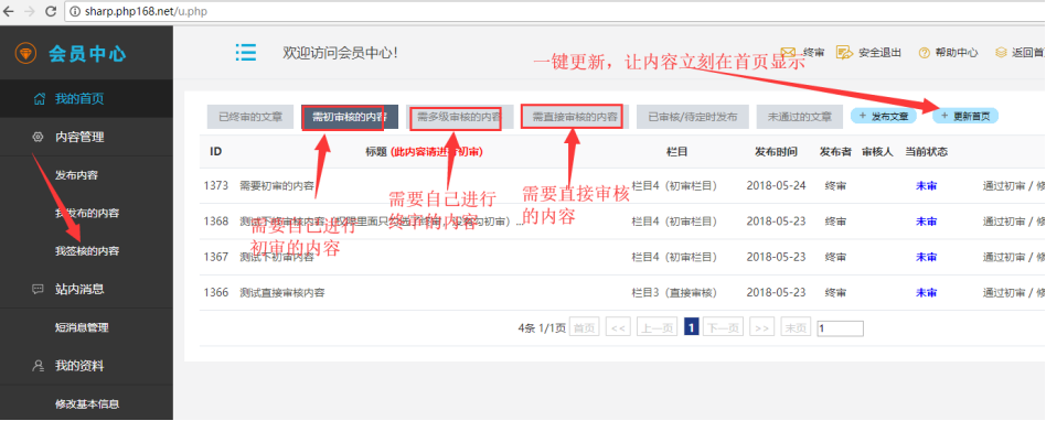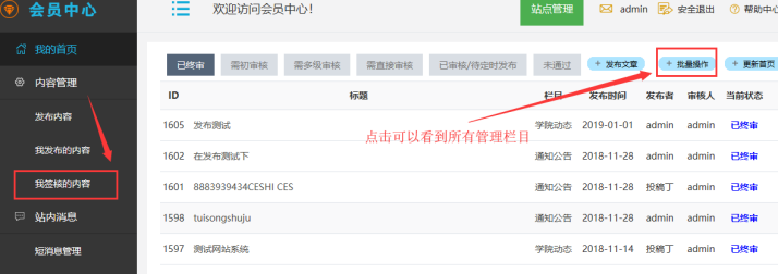 總結就是:主站權限可以細化到個人、細化到欄目。 審核內容都在會員中心操作。