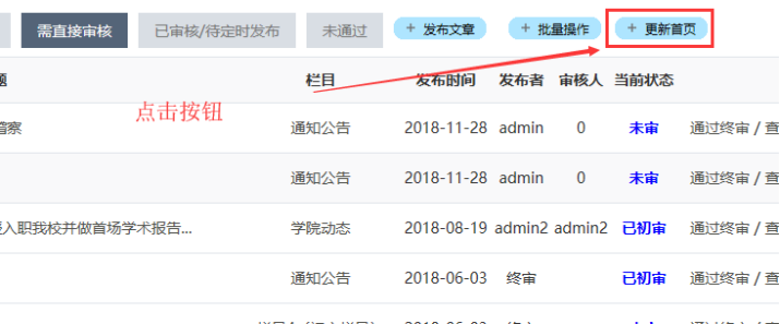 更新首頁:上面的界面中,右邊有一個“更新首頁”----------如果想審核后的內容立刻在首頁顯示,請點擊此處。