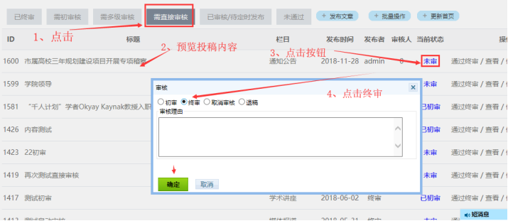 先點擊“需直接審核”按鈕------------這樣可以看到我所需要的待審核的內容------再預覽下這些投稿內容----------接著點擊“未審”按鈕,進行“終審”或“退稿”-------最后點擊下面的“確定”按鈕