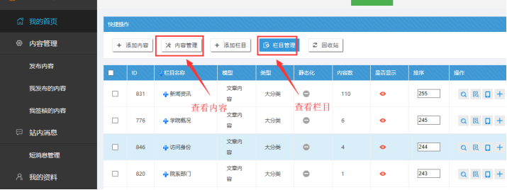 如果欄目內容需多級審核,就會用到“需初審核的內容”和“需多級審核的內容”。