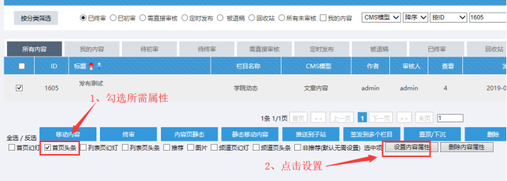 可以對內容進行屬性設置(首頁頭條、推薦、首頁幻燈片等)、可以推送數據到子站、簽發數據到多個欄目,等各種操作