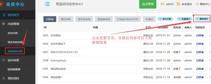 -----進去后可以進行內容發布、內容審核、更新首頁