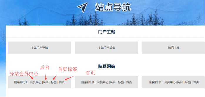 每個網站會提供一個統一入口地址,這樣各個子站和主站的老師,后續只需收藏此頁面,就可以操作上面相關入口的問題;這樣系統操作就變為非常簡單。