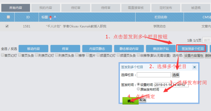 我們有時候需要將一篇或多篇內(nèi)容,簽發(fā)到多個欄目顯示,就可以用到“簽發(fā)到多個欄目”操作;相當于在這些欄目重新發(fā)布了內(nèi)容。