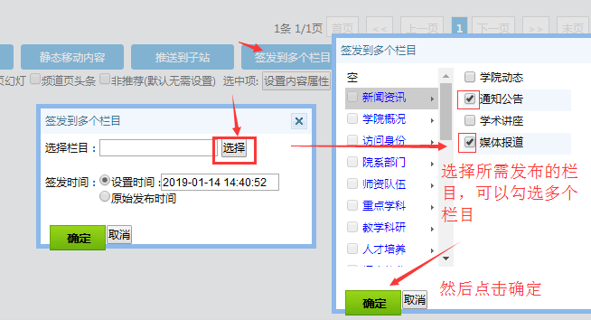 操作步驟: 進入操作頁面后---------點擊“簽發(fā)到多個欄目”---------點擊“選擇”按鈕,進行欄目選擇---------然后看看是否修改簽發(fā)時間(就是新內(nèi)容顯示的發(fā)布時間)-------點擊確定