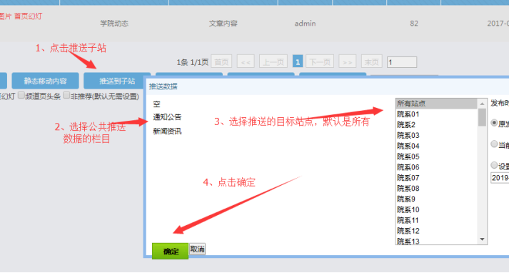 操作步驟: 進入操作頁面后---------點擊“推送到子站”---------選擇公共站群欄目(事先創(chuàng)建好的,各子站有欄目提早和公共站群欄目做了對接了)--------------點擊確定