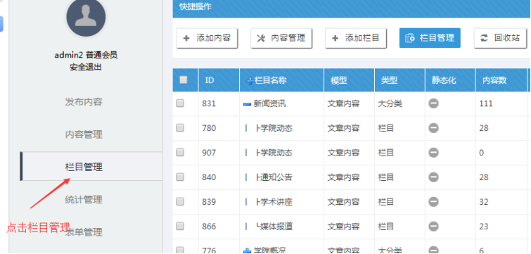 我們需要對欄目進行管理和修改,直接按如下操作; 網站后臺------點擊“欄目管理”------點擊修改按鈕: