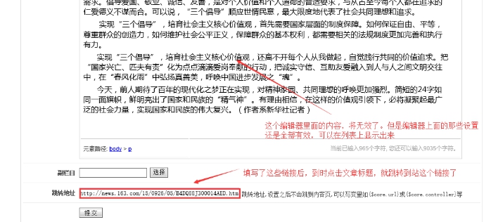 如果此處填寫了第三方網站的某個內容的地址,那么點擊此篇文章標題,就會自動跳轉到這個第三方網址內容。