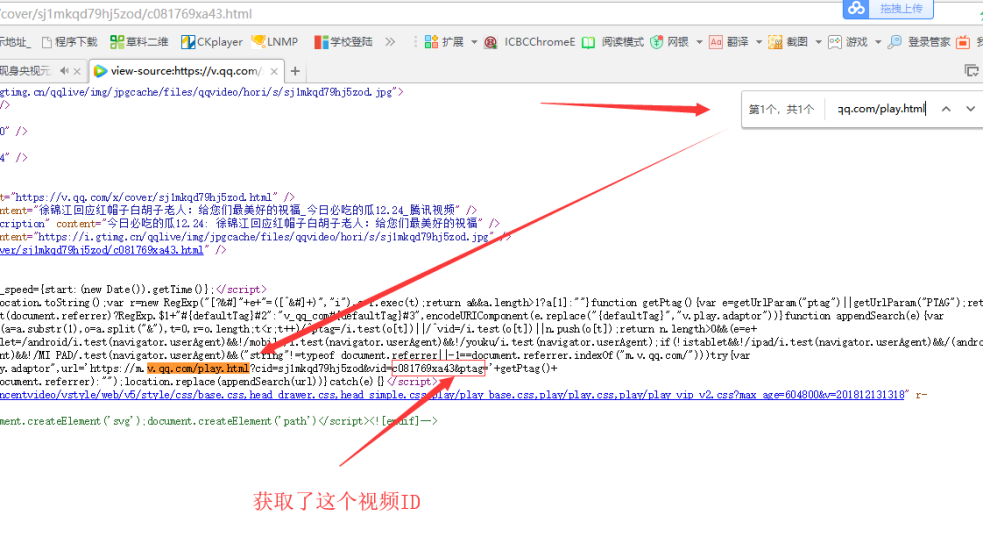 3、在源代碼界面中,查看搜索(ctrl+F鍵),輸入這個關鍵字: v.qq.com/play.html