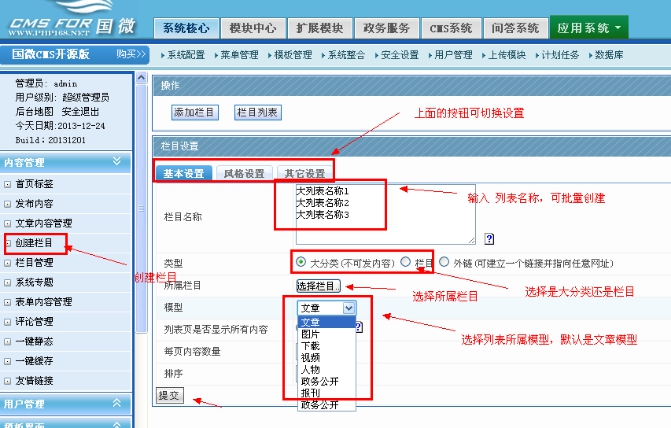 2:創建下載小類別。可以批量創建。上面三個欄目可以換行。然后選擇所屬大分類,就是剛剛那個創建的下載頻道。然后選擇下載模型,提交即可。