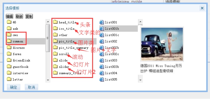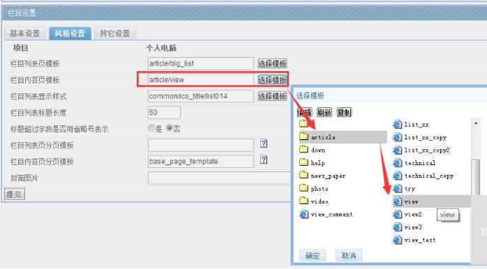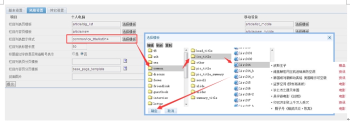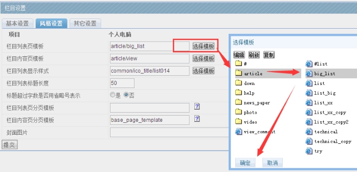 如果要修改大列表或小列表欄目模板,點擊選擇模板,然后選擇對應的模板列表