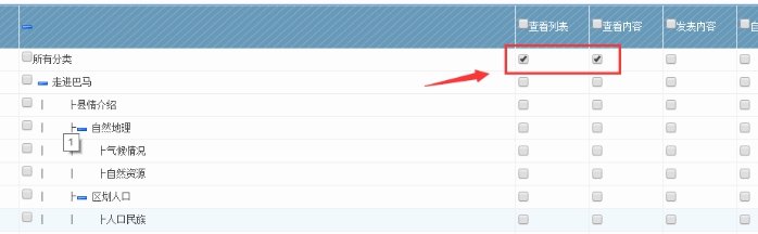 5、先勾選 查看列表和 查看內容,表示他可以查看任何欄目的內容。