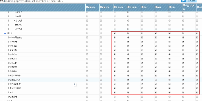 6、然后勾選對于的管理權限(上級欄目必須是勾選狀態,否則權限無效,不要的欄目權限,可以去掉勾選)