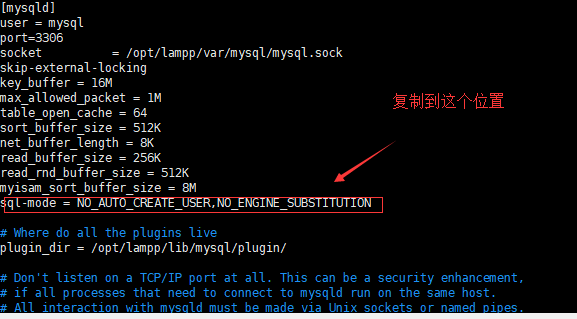 2)在A步驟中的目標my.cnf數據庫配置文件中,將剛剛上面那行代碼復制到此處(其他位置也可以),然后保存,重啟環境或服務器即可。