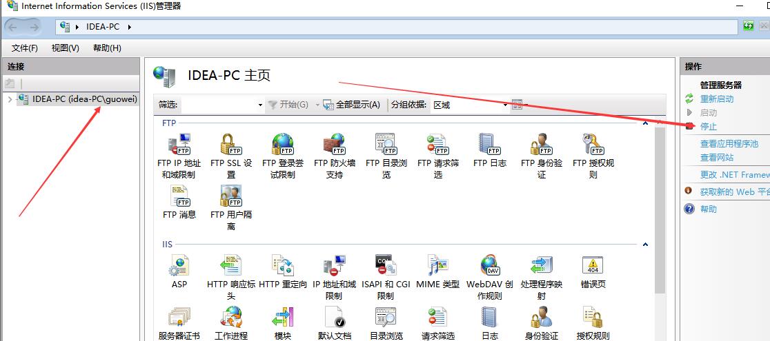 B:然后進入iis,選定默認的IIS網站,并關閉