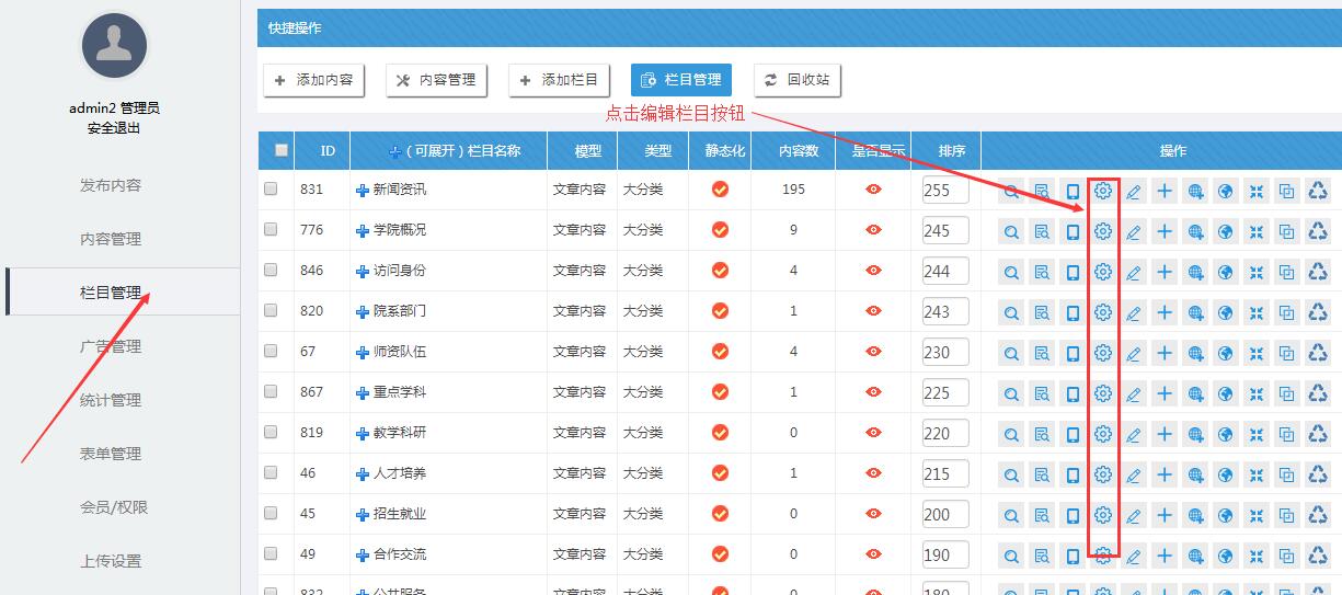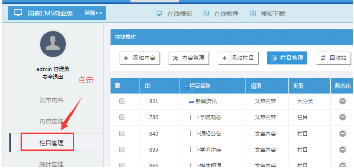 A:進入后臺--------點擊欄目管理(當然可以添加新欄目的形式)
