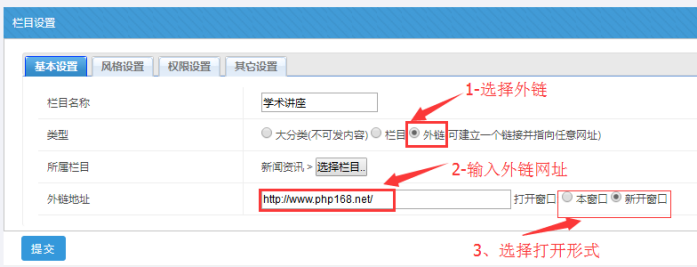 1)、勾選外鏈:表示欄目進入外鏈功能狀態了;