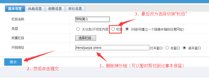 A) 、進入后臺------點擊編輯此欄目----------先刪除掉外鏈地址里面的內容-----------然后點擊提交---------接下來類型選擇“欄目”------點擊提交 (然后就可以重新設置欄目內頁模板了)