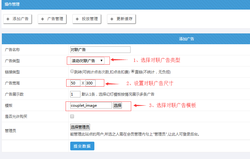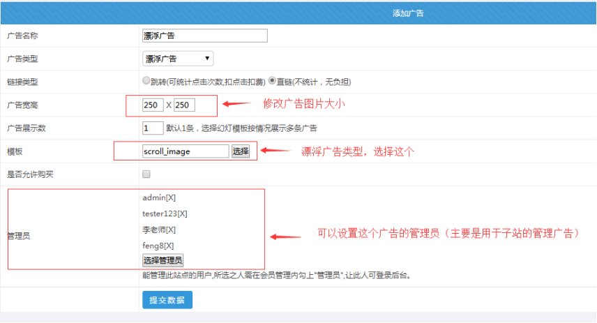. 本廣告管理員:選擇可以管理此廣告的管理員(主要是用于站群子站可以設置自己的廣告)