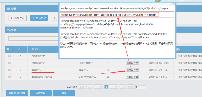 說明:要顯示廣告,就必須做如下動作:進入后臺的廣告模塊,創建對應的廣告類型(比如漂浮型廣告、對聯型廣告),--------然后復制生成的js調用到首頁的某個位置--------最后再每個類型廣告下添加廣告-------再更新緩存靜態首頁,這樣廣告就能在首頁顯示了。