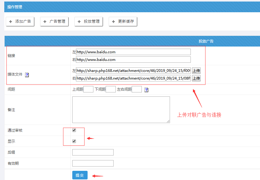填寫好左右連接、上傳左右圖片;另外可以設置對聯廣告上下間距。