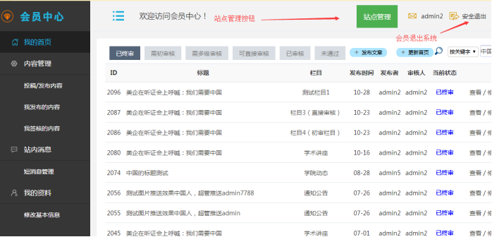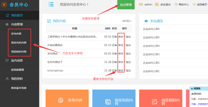 就是讓所有用戶,在此處進行內容發布、內容審核、修改;同時管理員還可以進行部分系統管理,比如更新首頁、設置屬性、更新緩存。