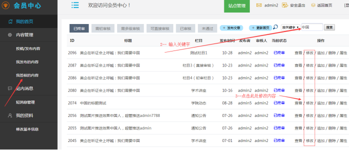 進入會員中心----我發布的內容------選擇發布的內容,各個狀態情況-------還可以對自己的內容進行修改(修改后的內容重新進入初始化審核狀態)。