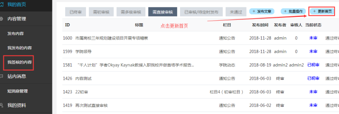 如果您是欄目管理員或系統管理員,需要對投稿人發布的內容進行審核,就是點擊此處。