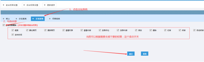 B:點擊------主站系統(tǒng)-----可以勾選這些全部(這個是權限的基礎開關,必須這里設置了,后面設置的細分權限才有效果;)