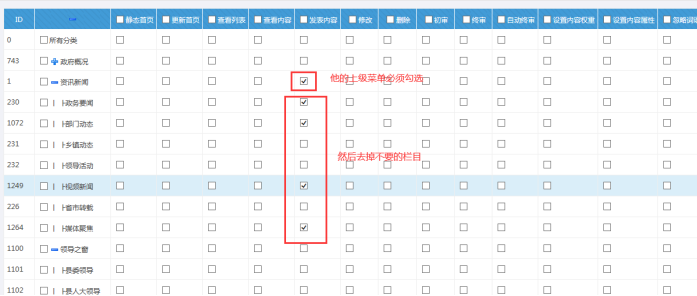 C:如果只要此人對某些欄目有發(fā)布權限,設置如下:(上級欄目必須勾選中,一般是自動的,否則無權限)