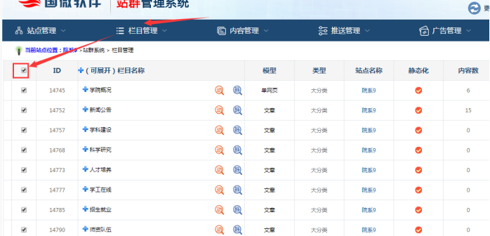 E:開靜態欄目和內容,勾選所有欄目------點擊靜態欄目和靜態內容