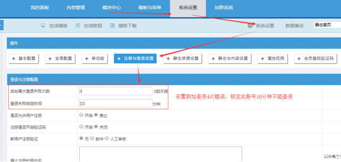 二、如何關閉和開啟系統的用戶注冊;如何多次輸入錯誤密碼鎖定賬號;