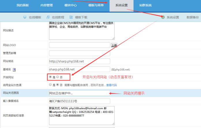 有時候需要臨時關閉網站,選擇“否”則關閉,然后輸入網站關閉提示;重新更新標簽緩存和靜態首頁。