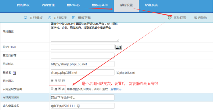 特殊紀念日子需要網站一鍵變灰,直接開啟“是”;然后更新全站緩存、靜態首頁;(如果整個網站都需要變灰,則靜態所有欄目和內容)