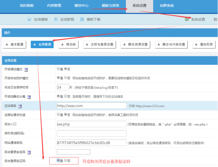為系統安全,一般需要開啟登錄驗證碼;如果有時候登錄驗證碼反復錯誤,則登錄后臺關閉驗證碼。