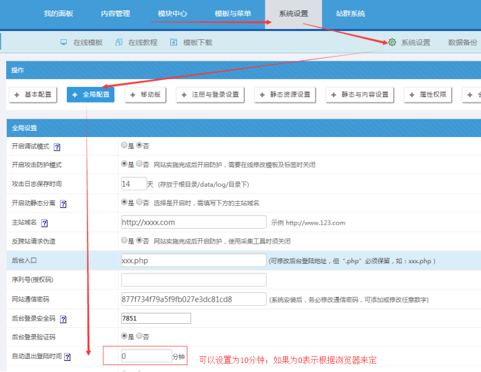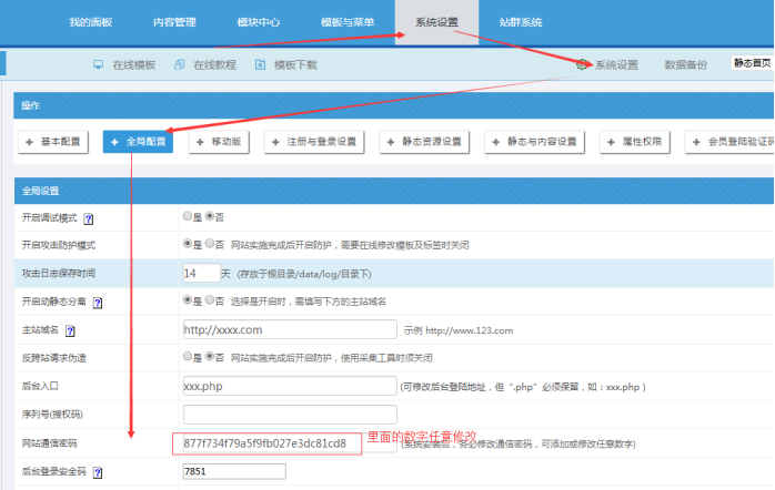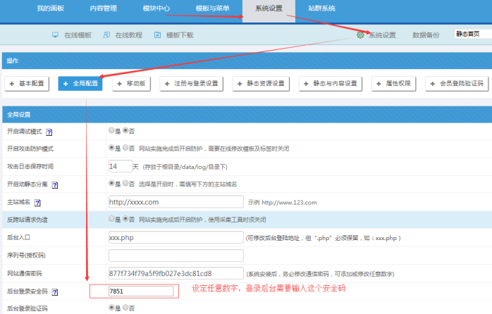 為了系統安全,我們有時候需要設置雙重密碼,就是安全碼,安全碼輸入數字即可;設置后,登錄后臺,就需要輸入這個口令才能進去。 如果要取消,則刪除數字為空即可。