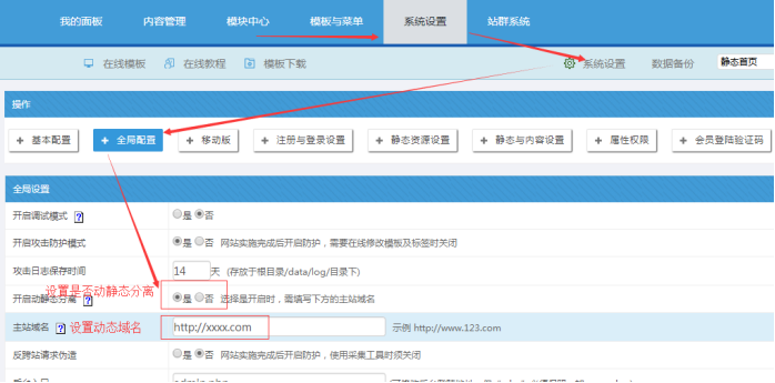 現在大型項目,一般都采用動靜態分離部署;就需要開啟動靜態分離設置,并輸入動態主站網站域名(就是你現在打開動態后臺網站域名);