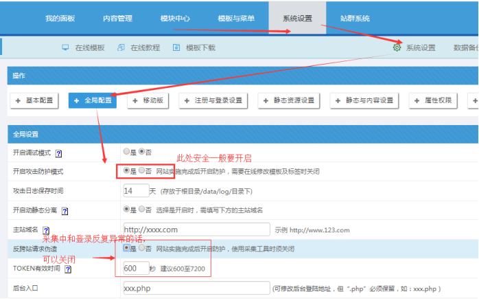 ”反跨站請求偽造”開啟的時候,需要注意是不是在采集,采集的時候需要關閉;如果登錄反復出現問題,可以考慮暫時關閉。