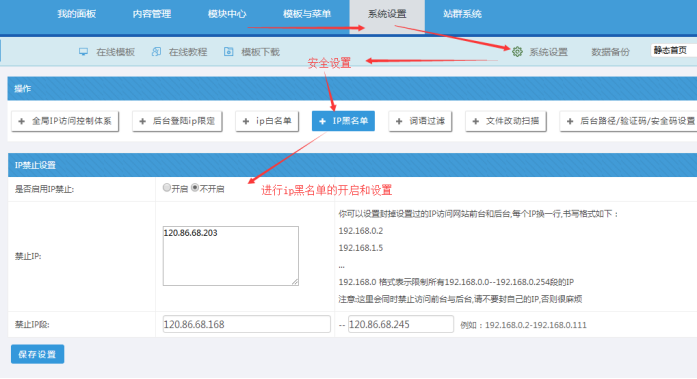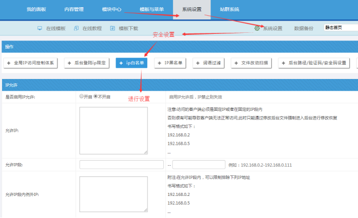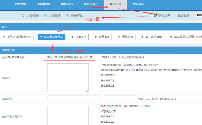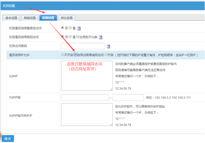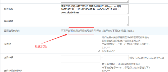 為了方便我們對各個欄目、內容、站點開啟只供局域網內訪問,我們可以設置公共的局域網訪問IP段。里面包括了允許公網ip、局域網IP段等。