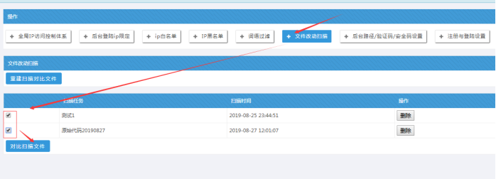 B:如果我們需要確認,我們現在的代碼有沒有被篡改,就重新點擊“重建掃描版本”,掃描成功后,刷新。勾選自己的版本和之前的校驗版本;進行對比掃描,就可以看到核心代碼是否被修改。