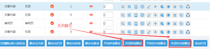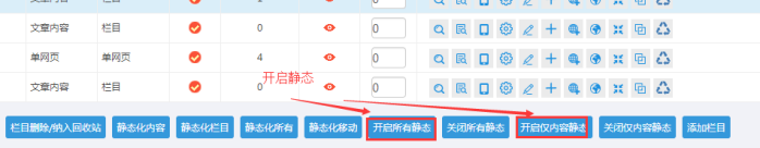 “開啟所有靜態”:表示欄目和內容都開啟靜態了;我們一般選擇開啟此處;他的效果狀態是“紅色”