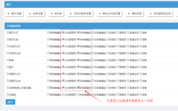 然后勾選各自角色所需的屬性功能;一般選擇“分站管理員”角色;讓分站管理員可以設置子站的屬性。當然對主站的終審編輯組也可以設置,他權限大點沒有關系。