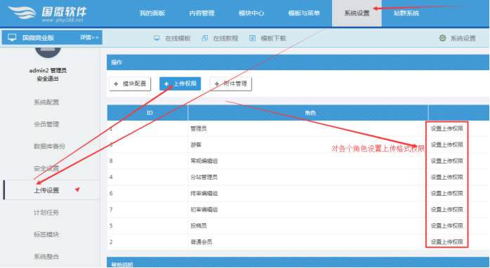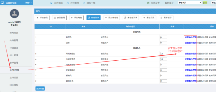 如果我們需要對不同的角色,設置不同權限,點擊此處;我們一般“設置前臺權限”即可,他管控著內容瀏覽、內容發布、內容管理。