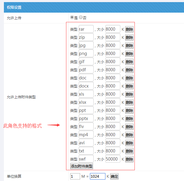 為了安全,我們進行要進行附件格式的控制;此處為允許上傳附件的總開關;添加允許上傳的附件格式。