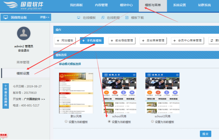 選擇手機版模板的方法,點擊提交;然后更新模板緩存(或全站緩存)----靜態移動版首頁(其他欄目和內容頁需要靜態)--在刷新看看效果。