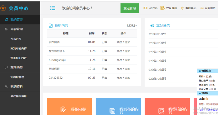 會員中心效果:會員中心功能包括投稿、內容審核、數據刪除、更新首頁等功能;所有人的內容操作基本都