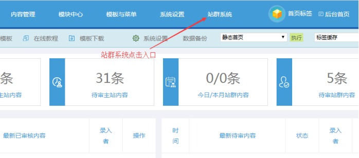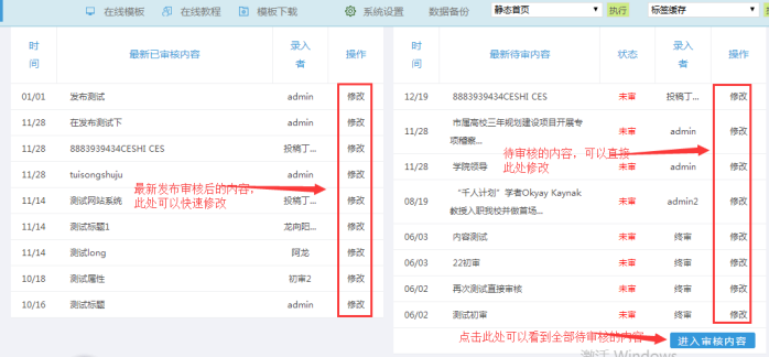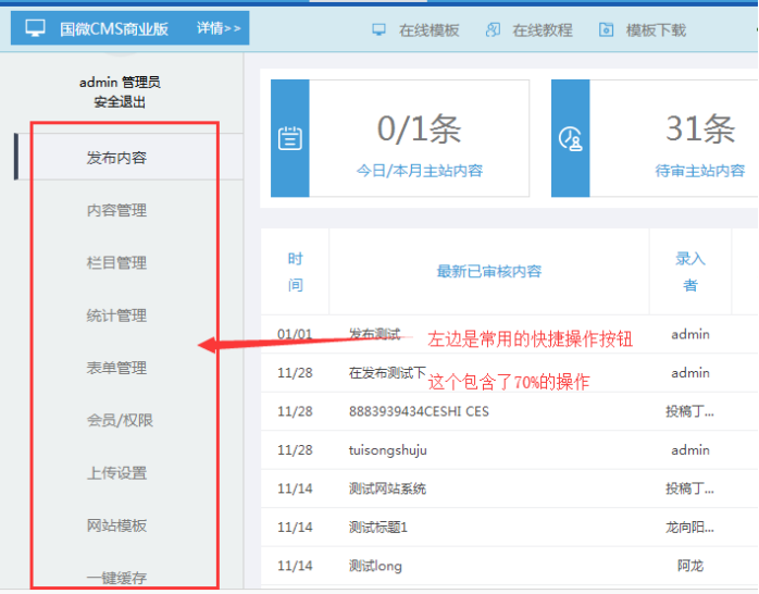 操作提示:此處可以快速修改最新發布內容、最新需審核內容;同時點擊鏈接可以進去列表;可以平常節約很多時間。