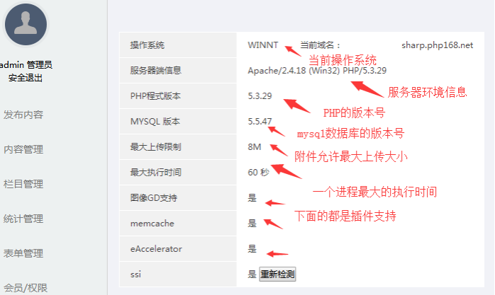 后臺初始頁左下方,此處可以看到安裝此網站的操作系統、數據庫版本、PHP版本、最大上傳設置、各個插件