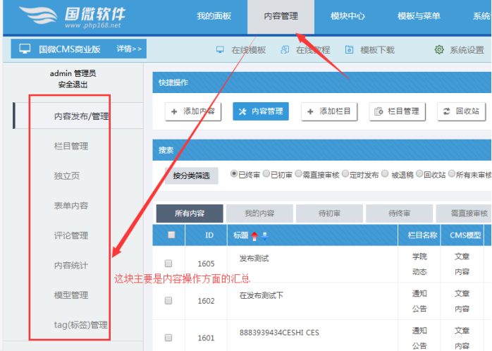 內容管理:此處可以進行文章內容刪除、編輯、審核、設置屬性、搜索篩選、推送分站等操作。