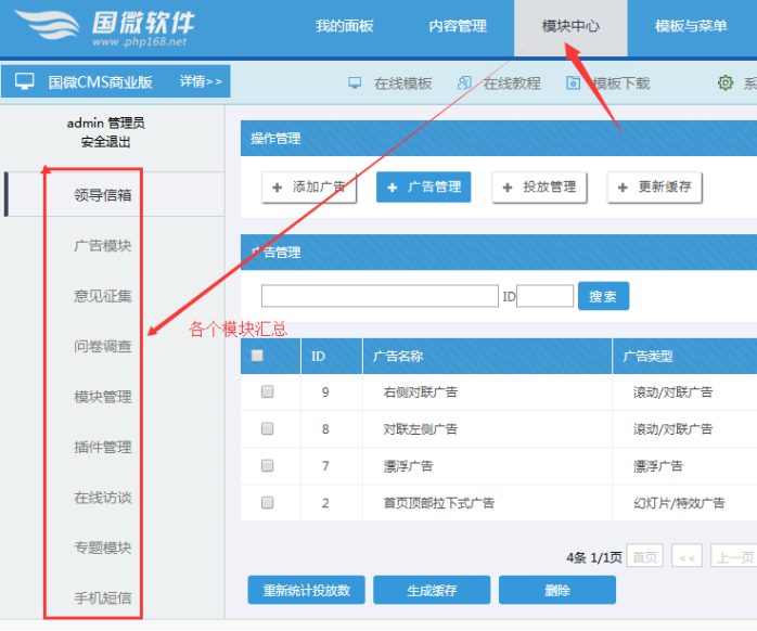 網站模板:可以一鍵替換主站模板;替換后需要更新模板緩存,靜態首頁。